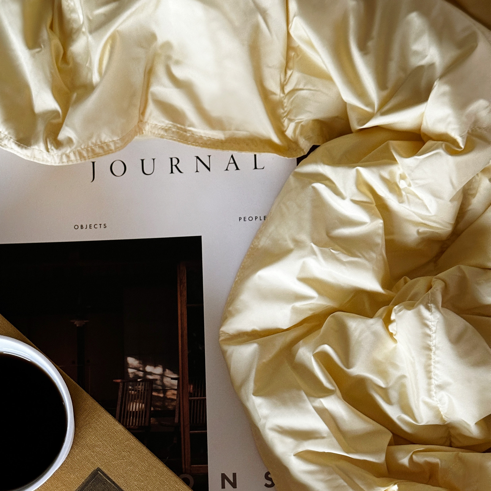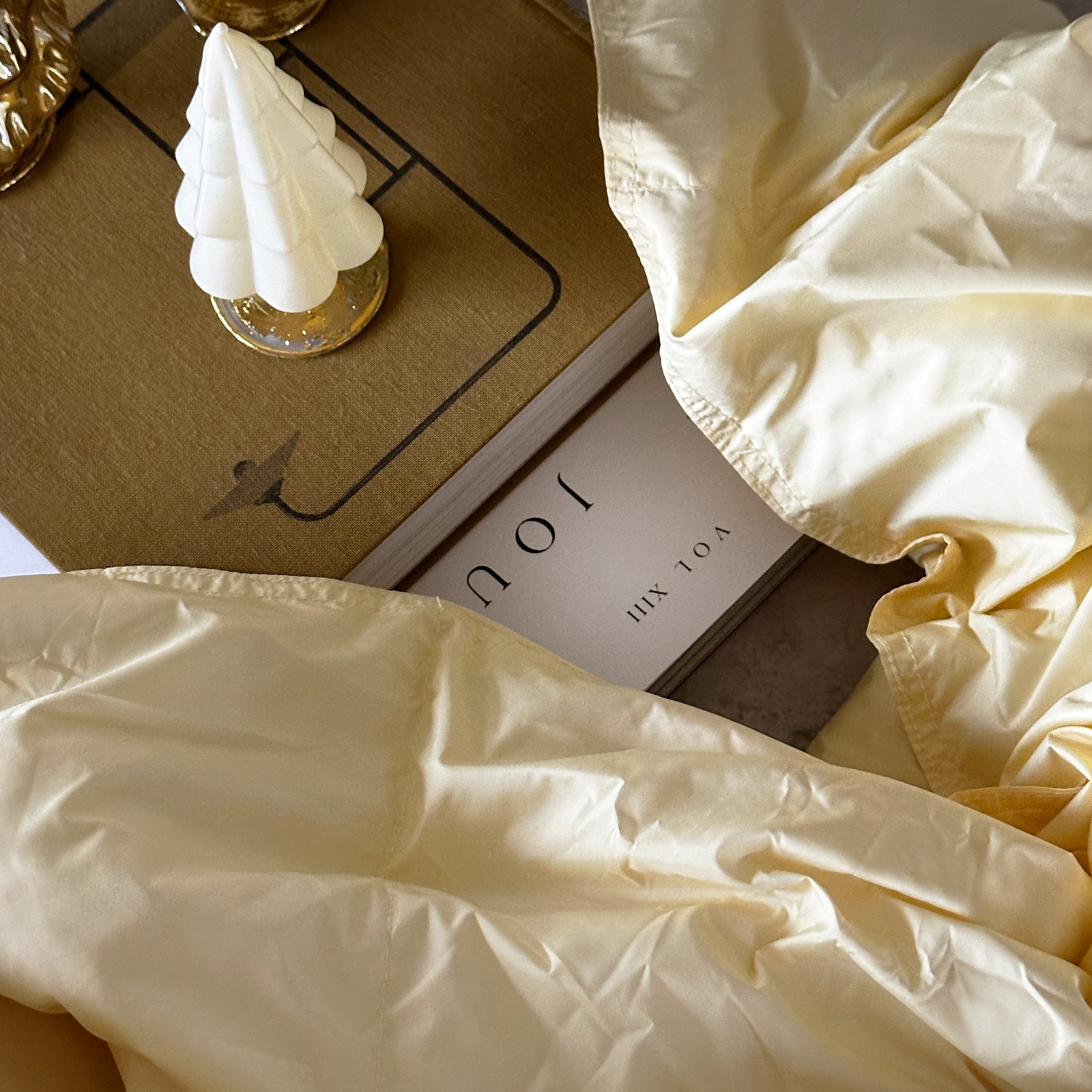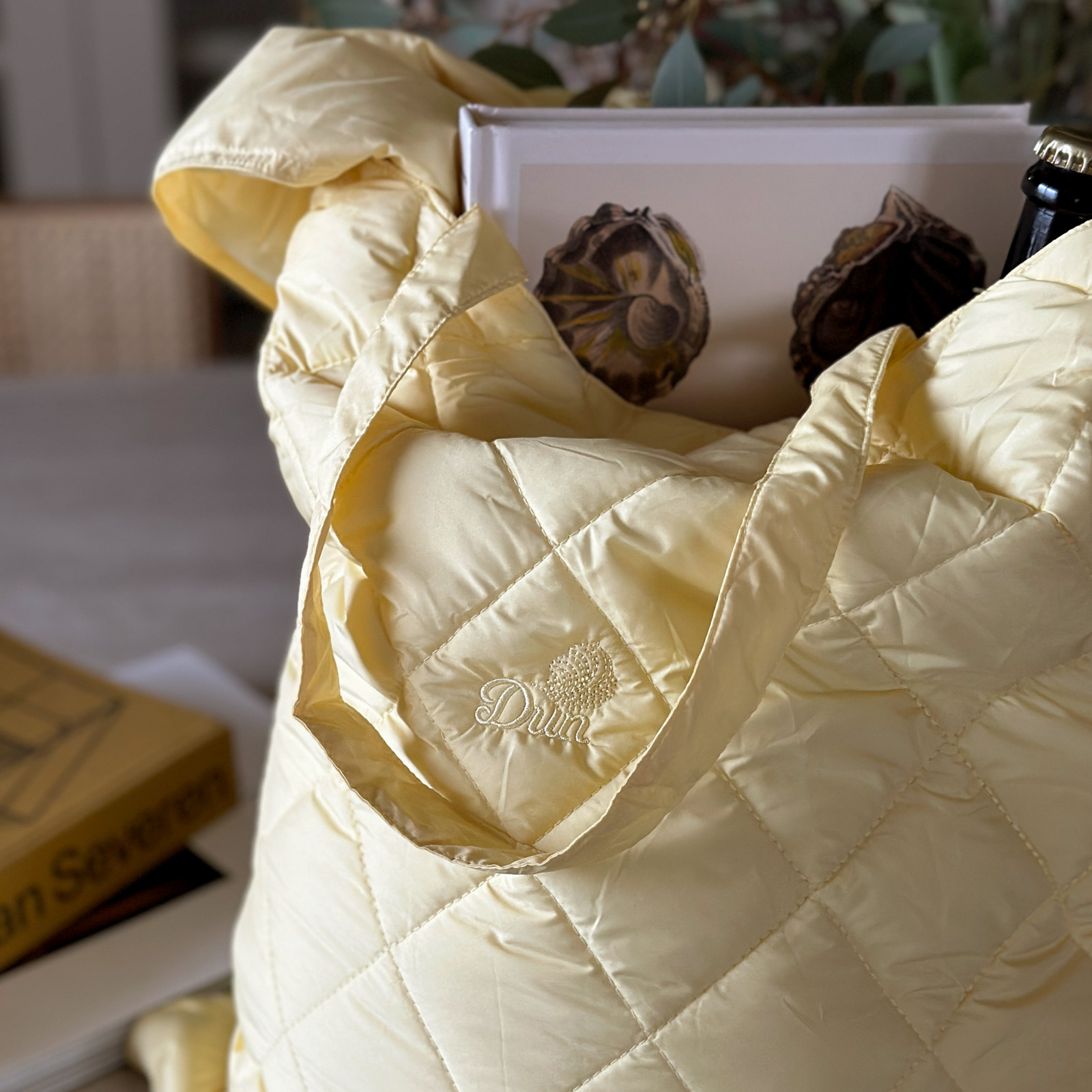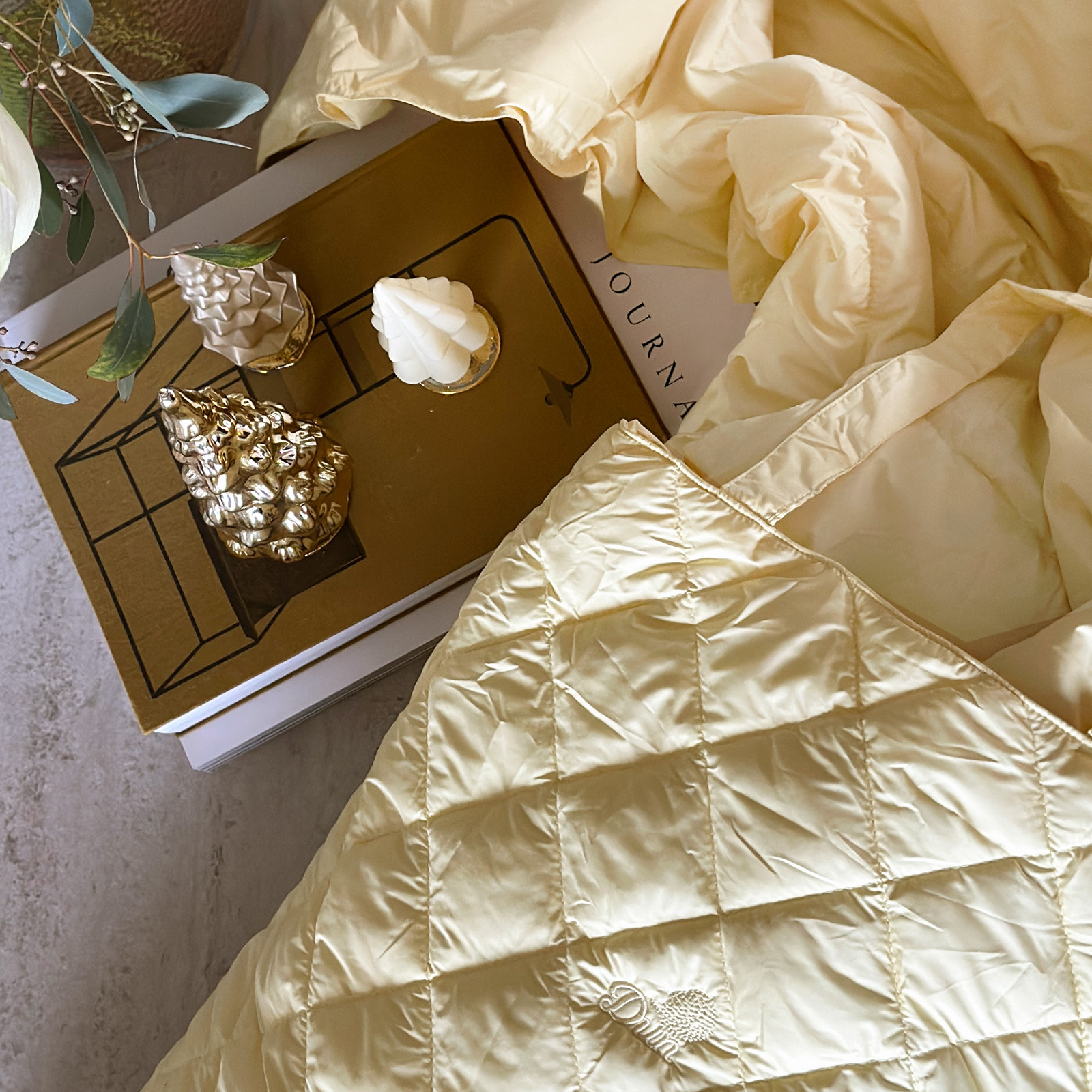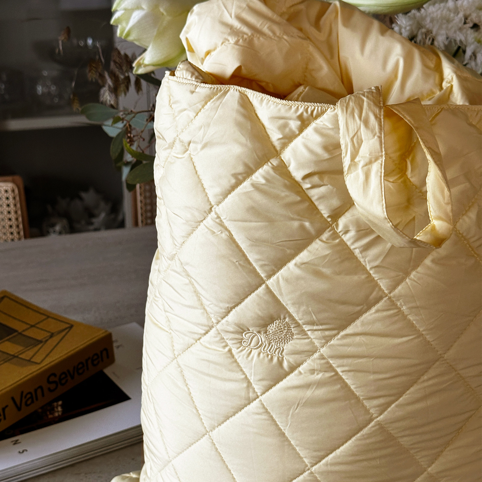 Kommer i en solid og praktisk quiltet veske, i samme gulfarge som dunteppet.