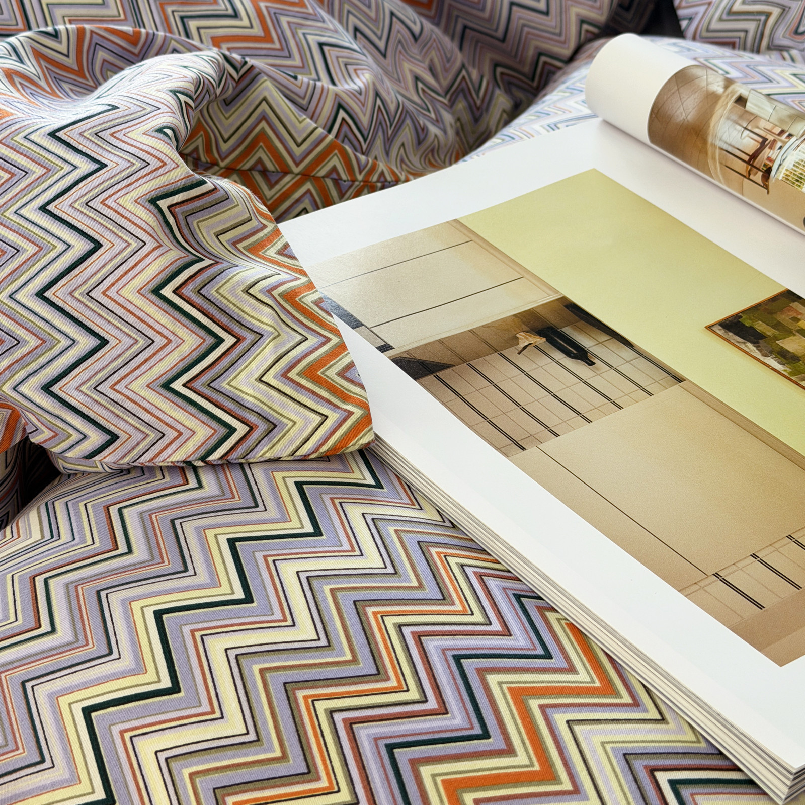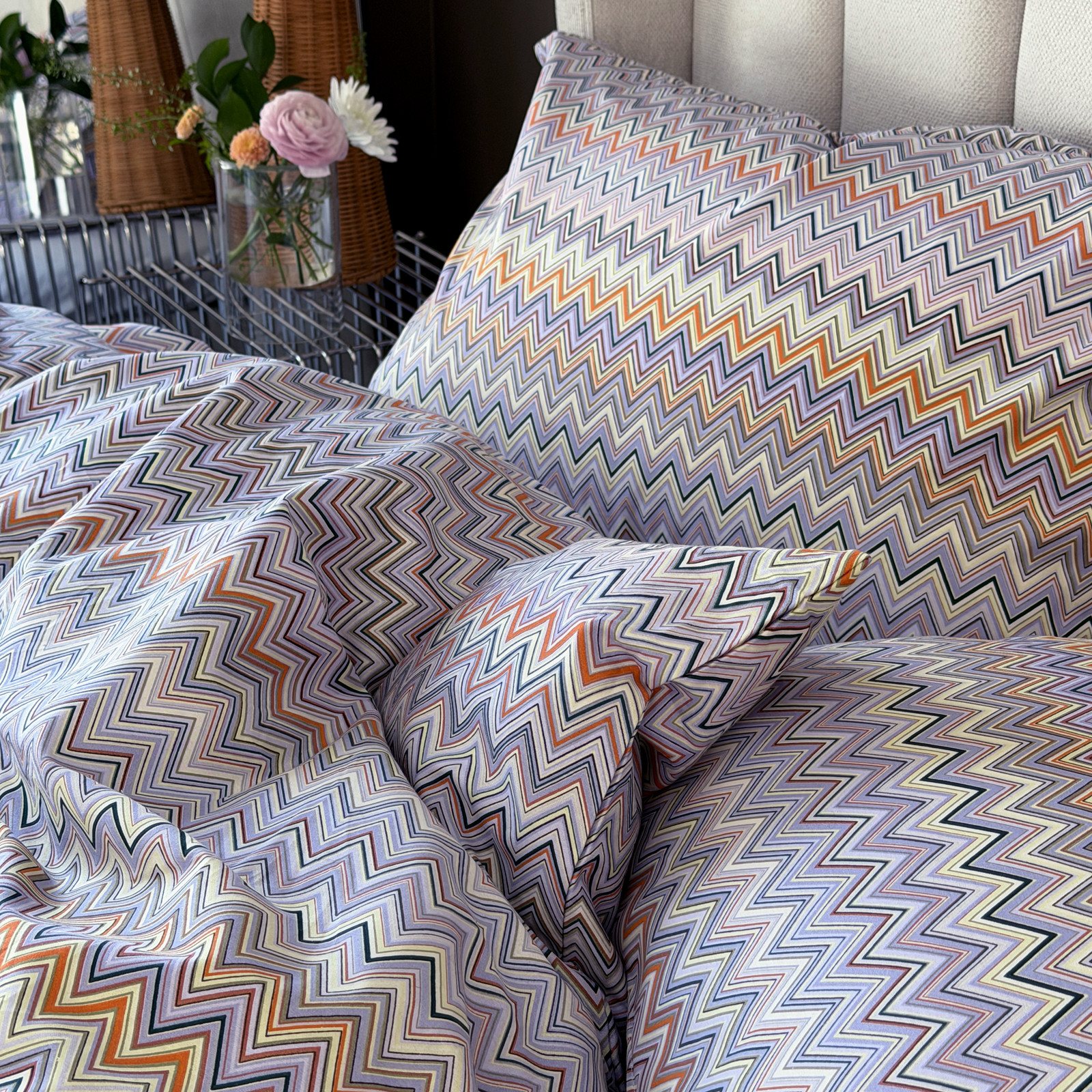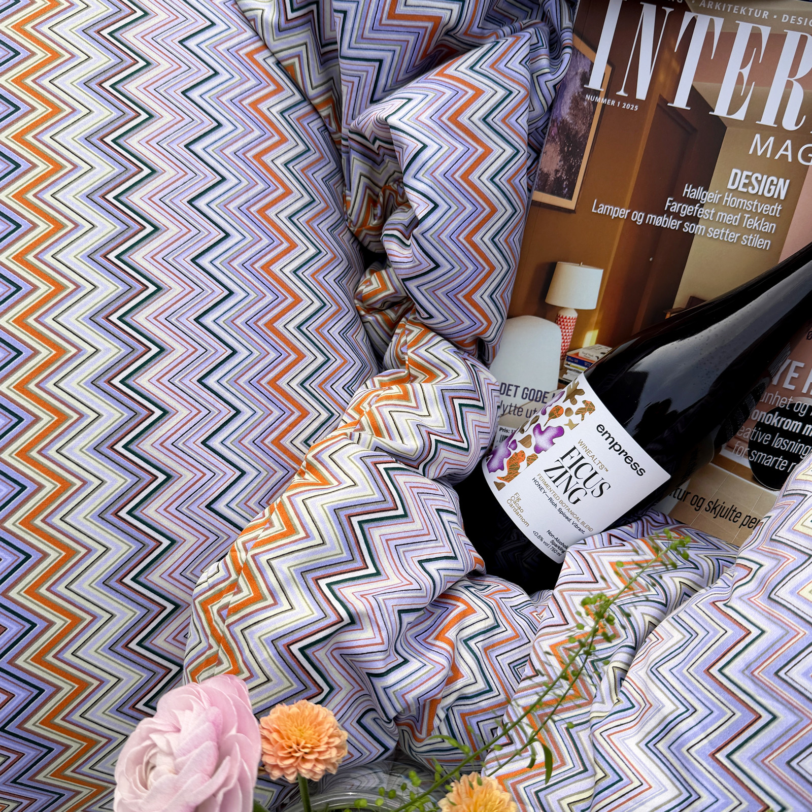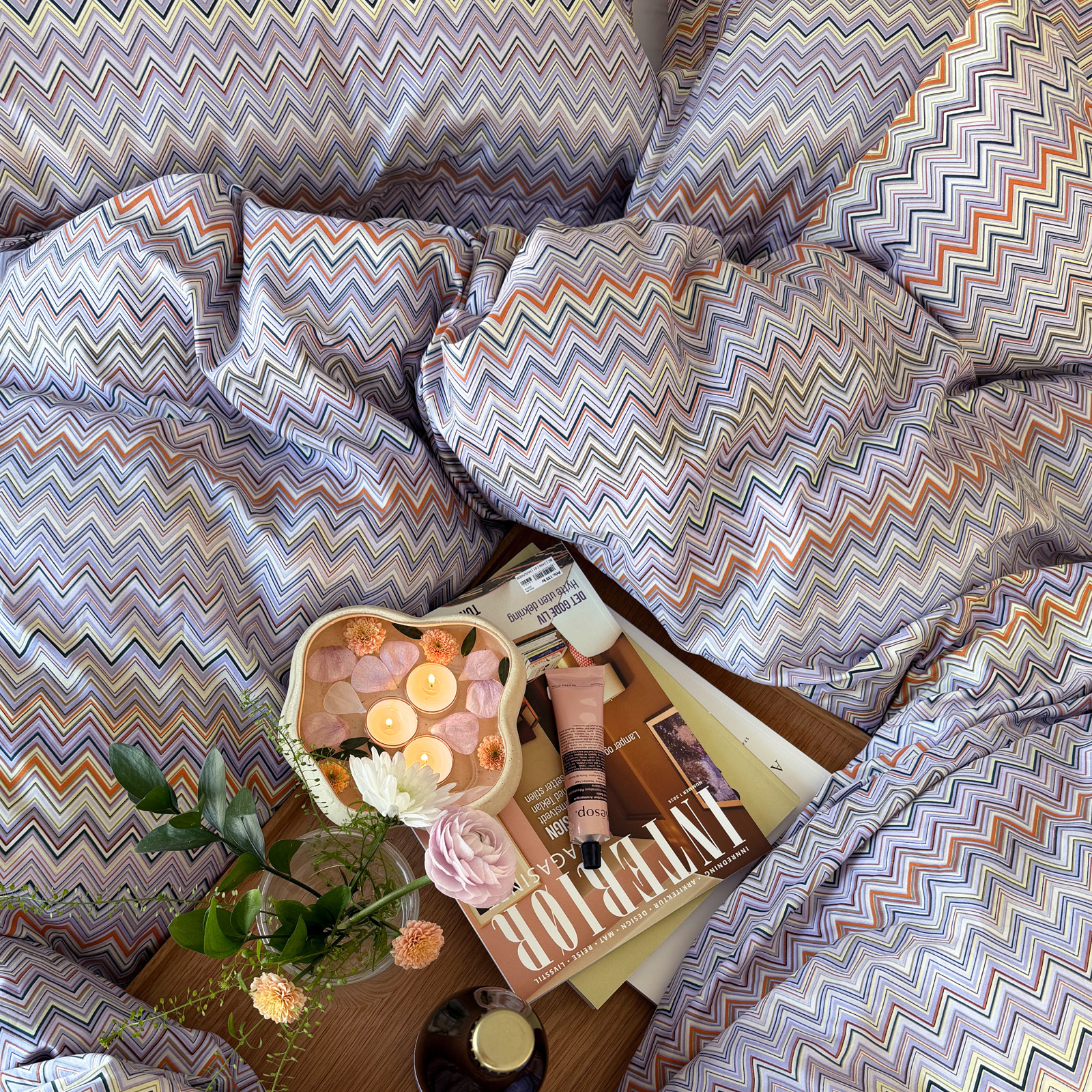 Sengetøyet har et sikk sakk mønster, med lyse lavendel-toner.