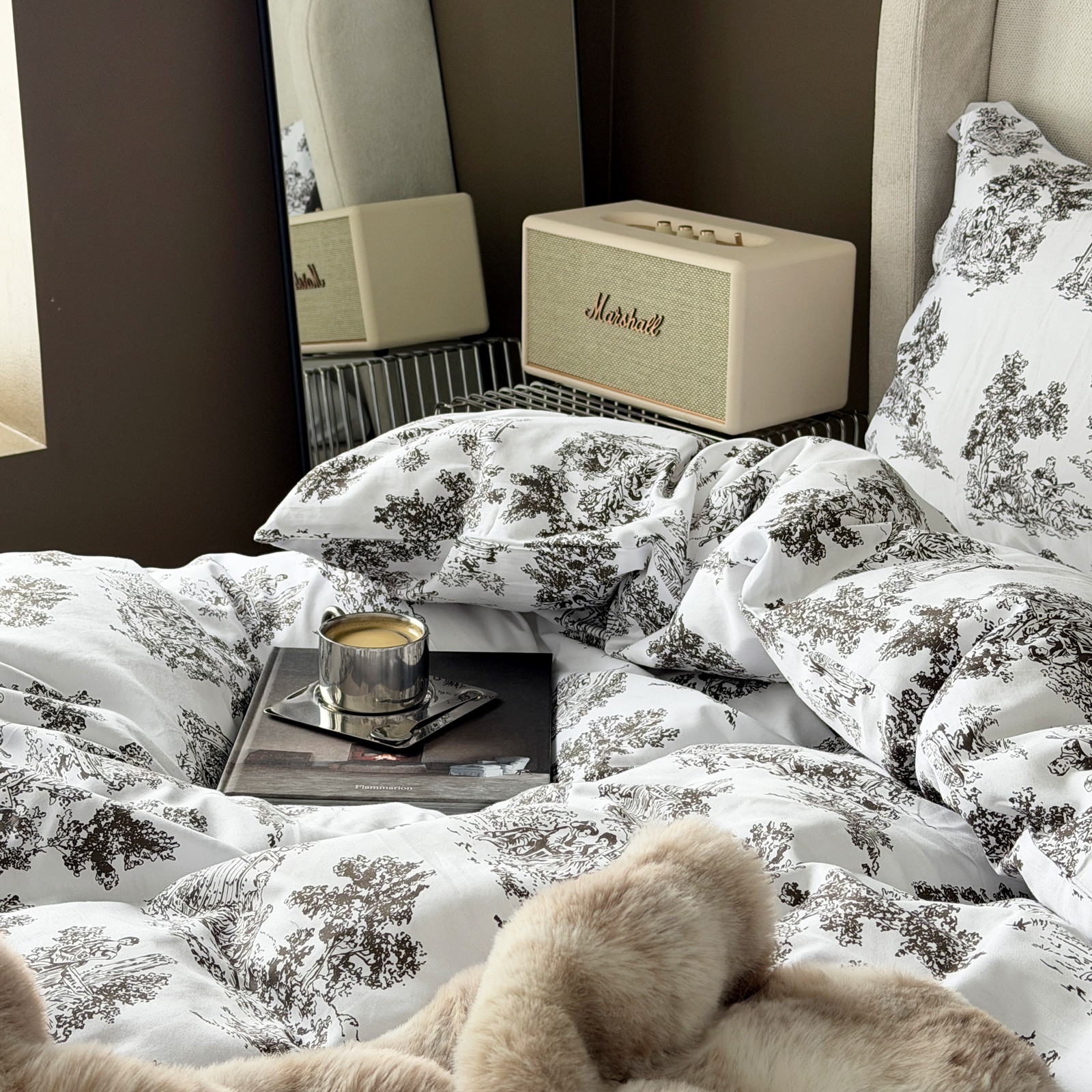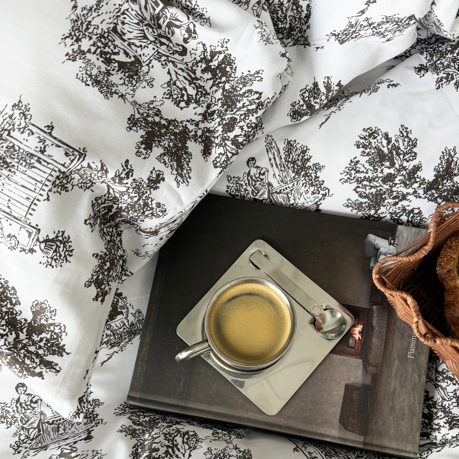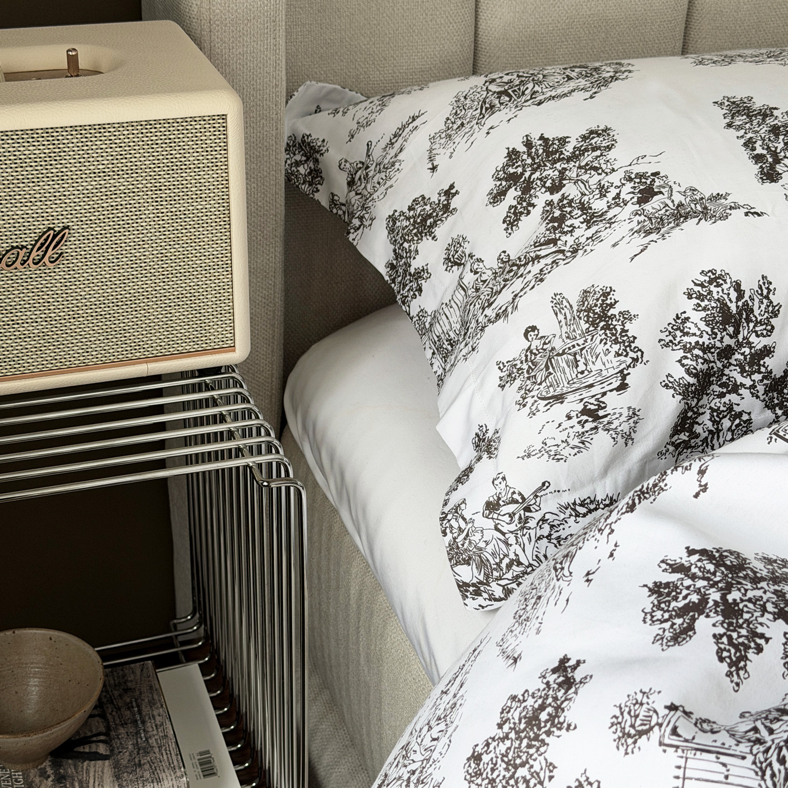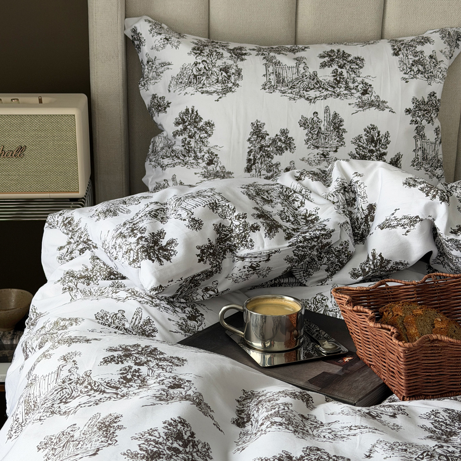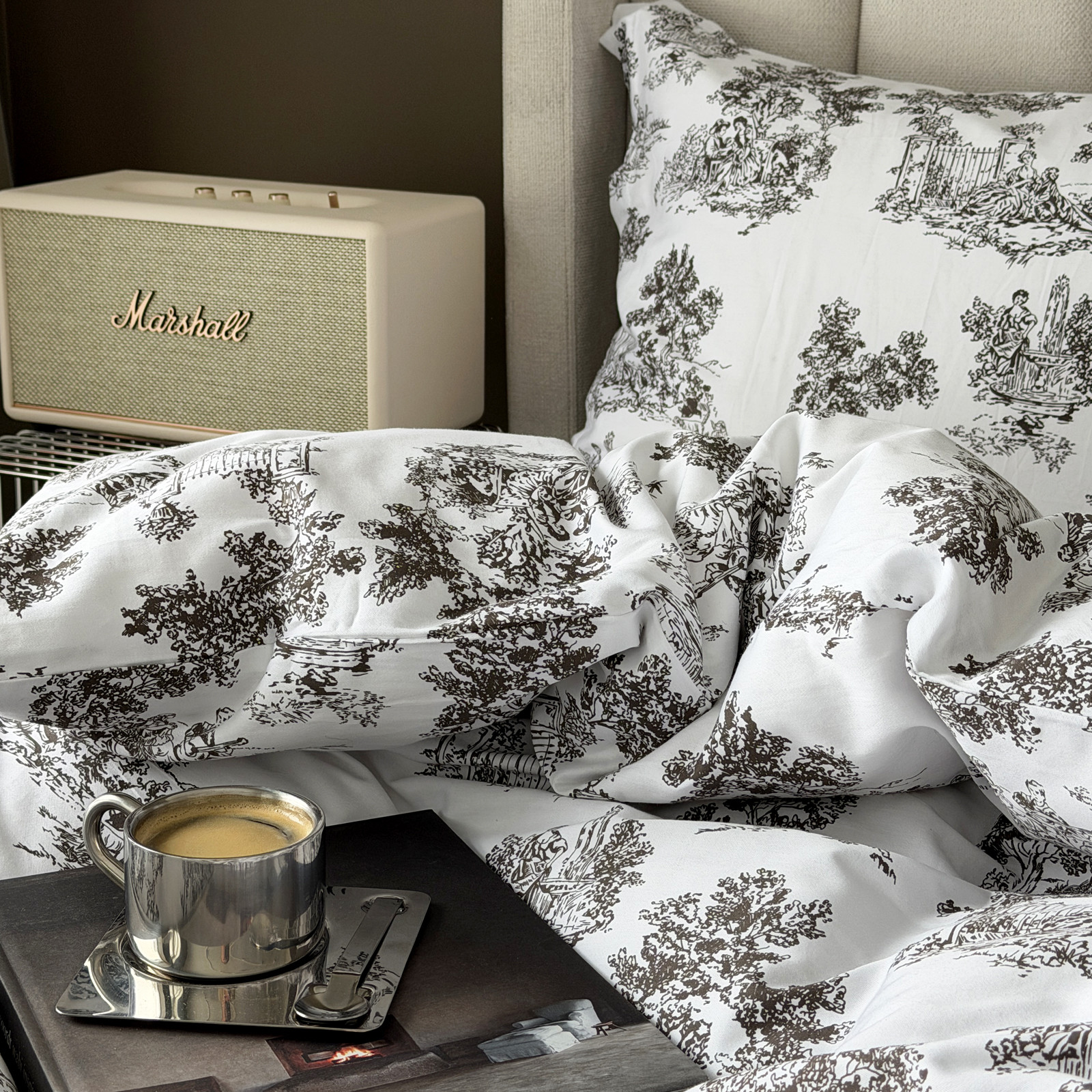 Sengetøyet har et blått og herskapelig "toile de jouy" print.
