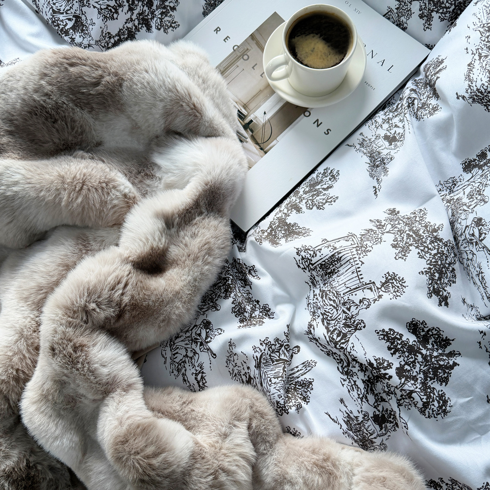 Sengetøyet har et blått og herskapelig "toile de jouy" print.