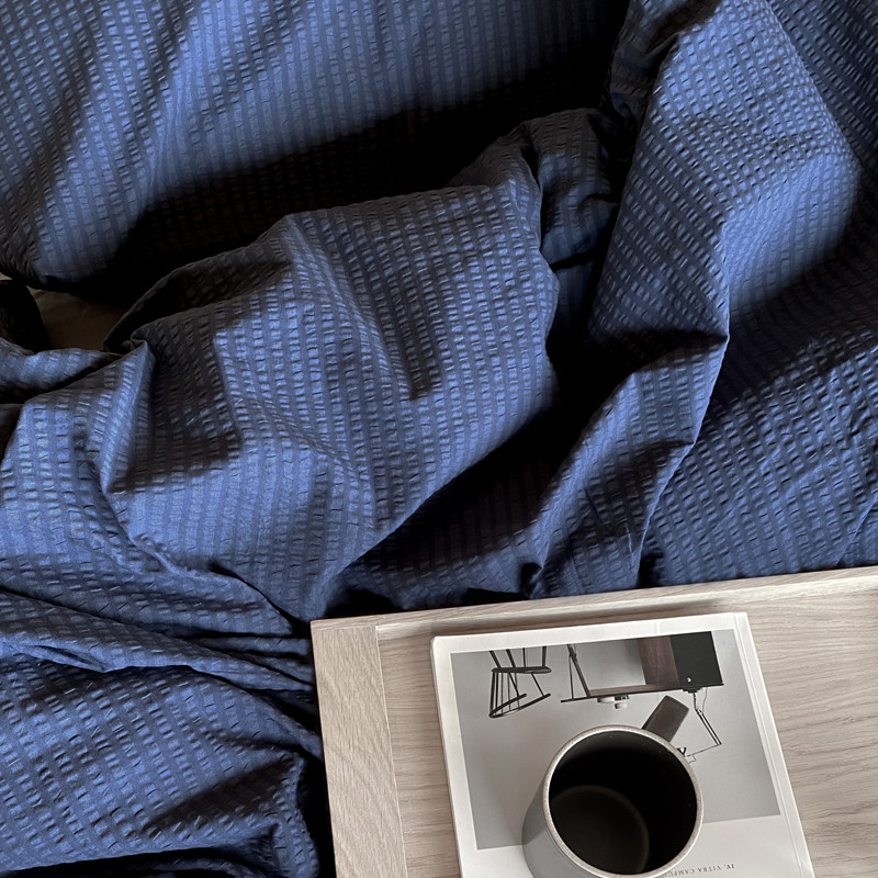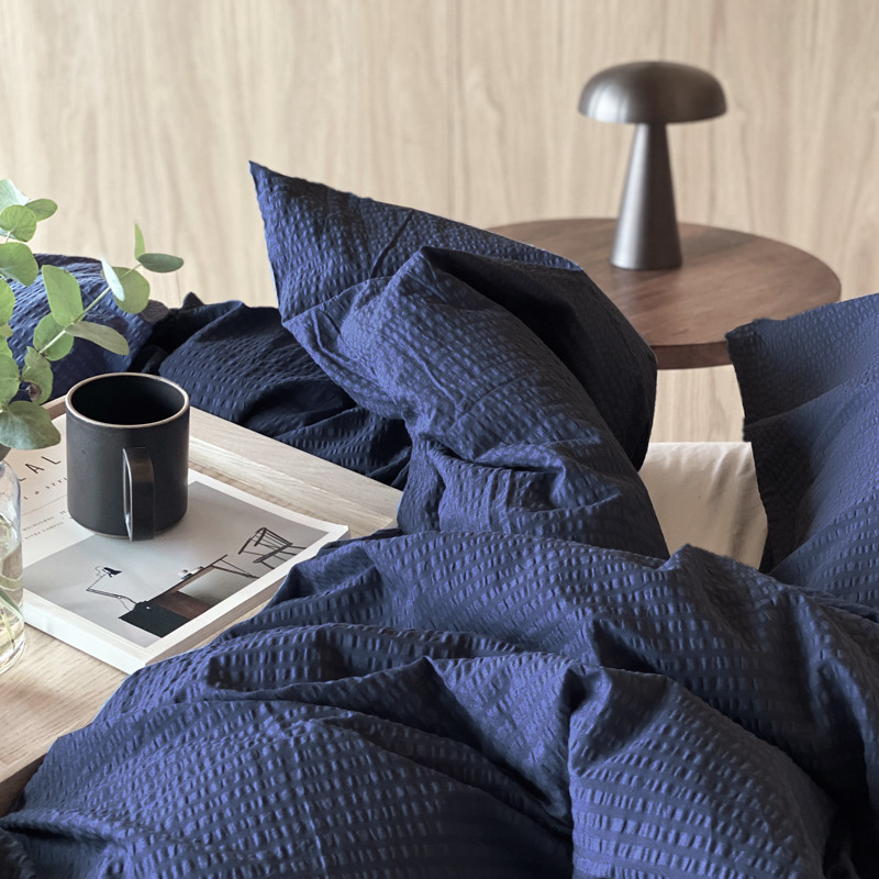 Bjerregaard Krepp har et rent og tidløst design. Dette sengesettet har en klassisk mørk blå farge.