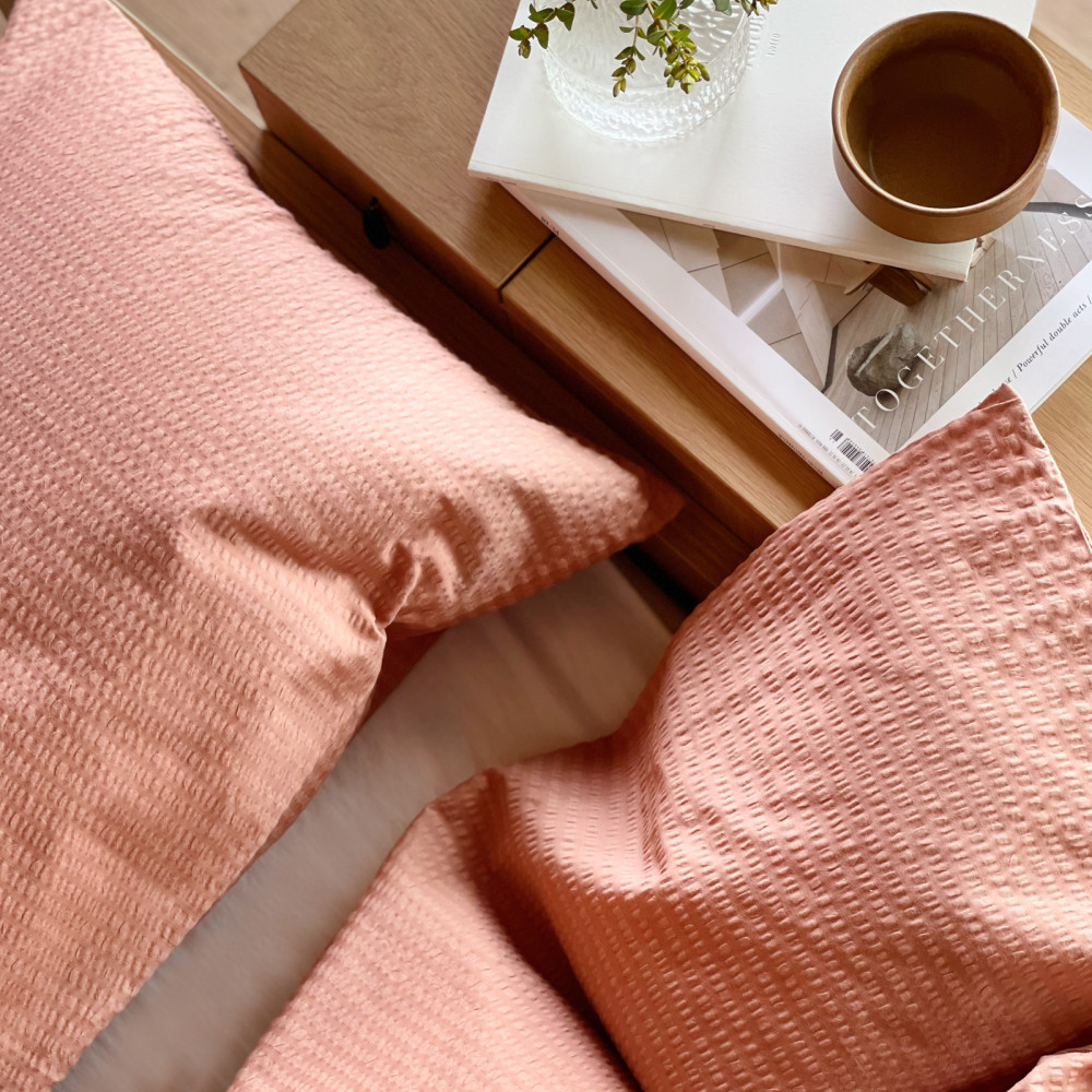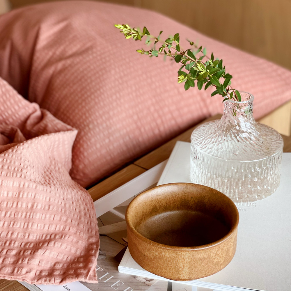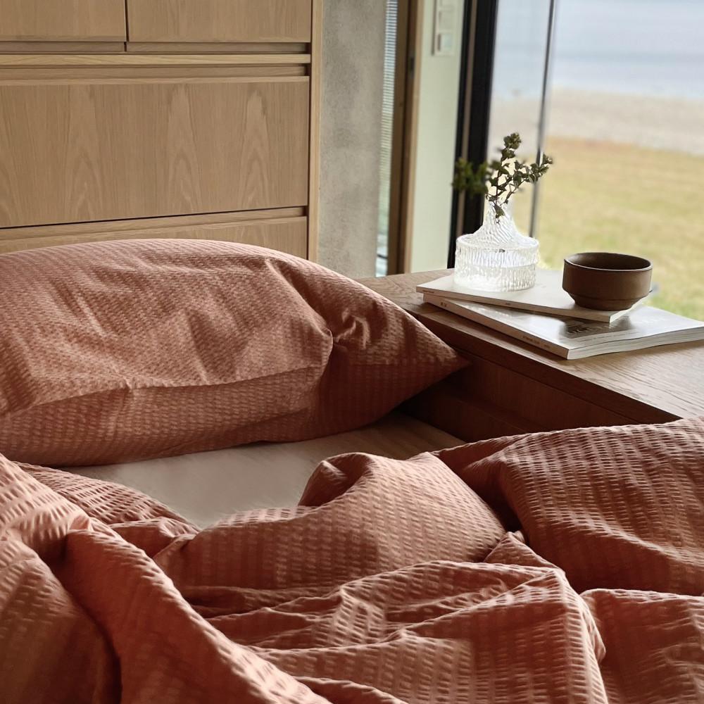 Bjerregaard Krepp har et rent og tidløst design. Dette sengesettet har en nydelig nøttebrun farge, med en touch av rosa.