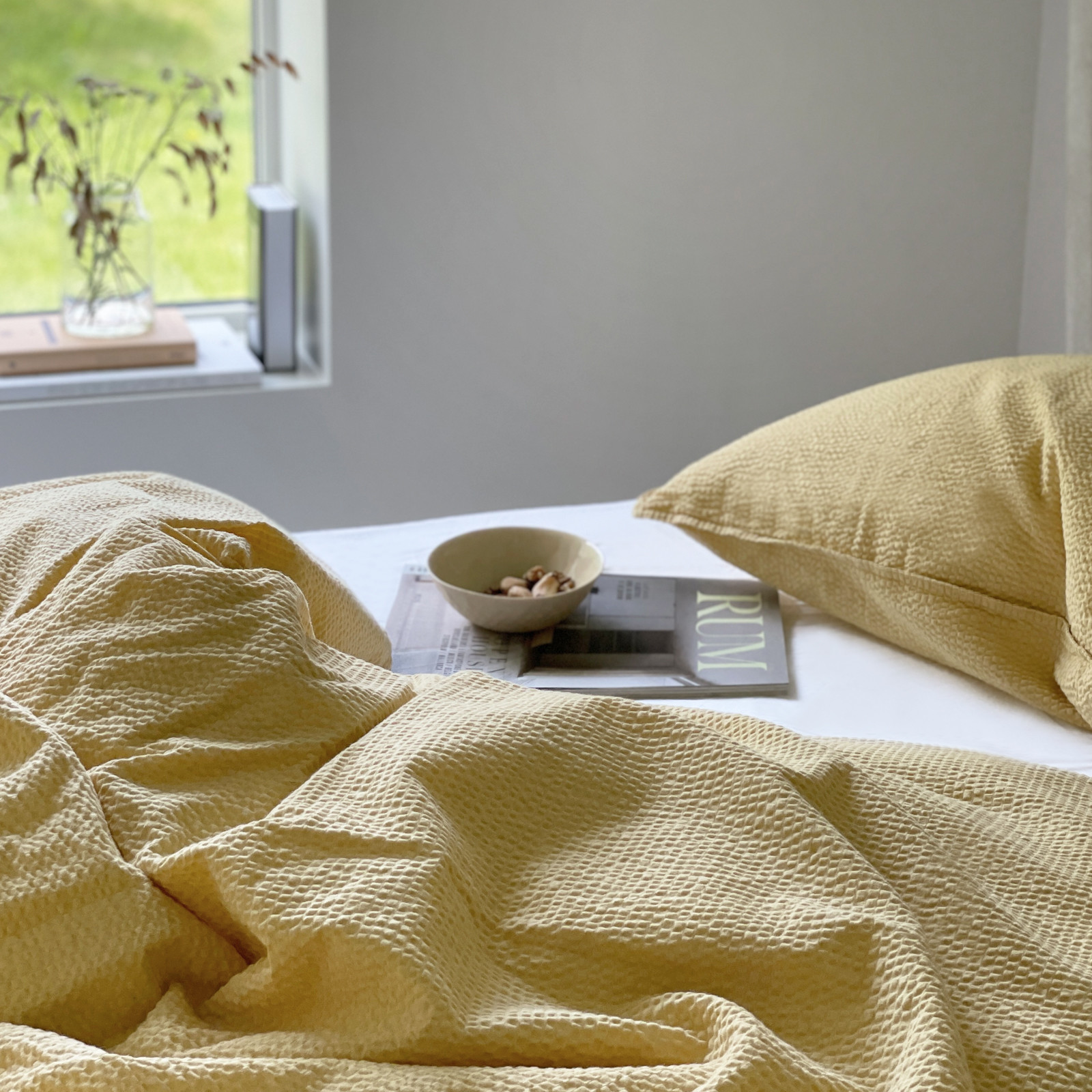 Vi har benyttet et finere garn og et høyere antall tråder, som gir et ekstra delikat og slitesterkt sengetøy. Kreppen er vevet, og ikke kjemisk fremstilt. Det betyr at krepp-effekten er vevet inn i stoffet, med et garn som er farget på forhånd, og som gjør at fargene bevares lenger.