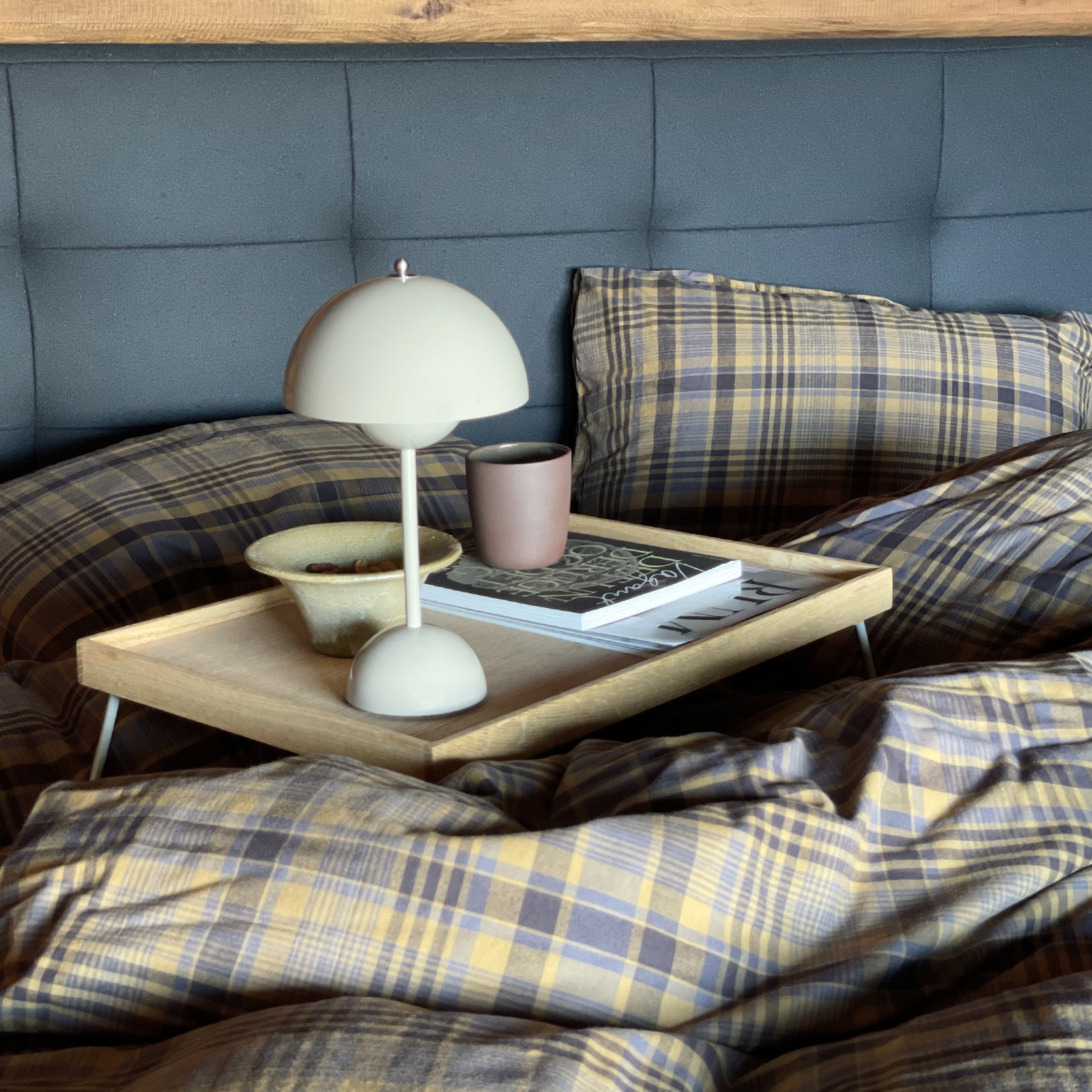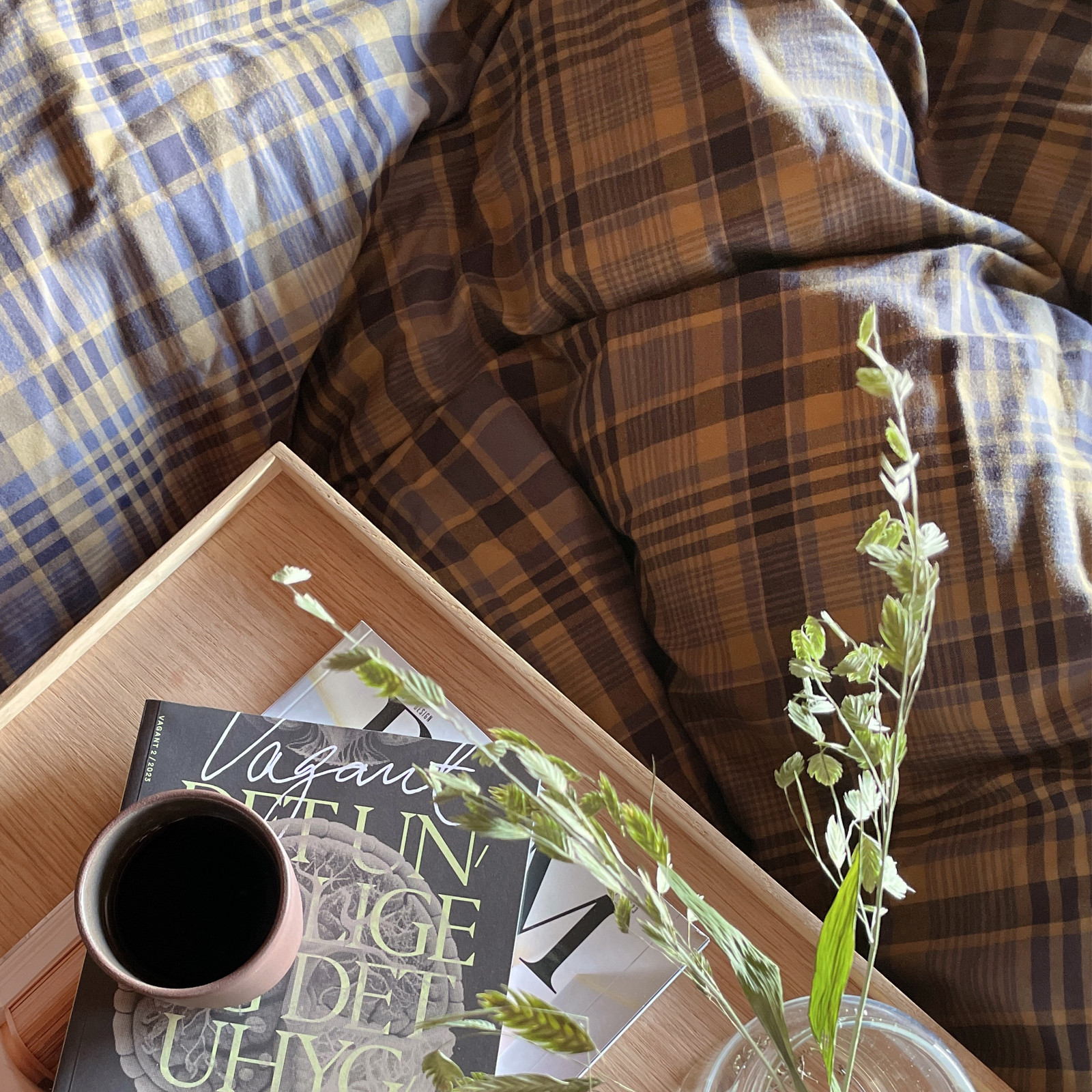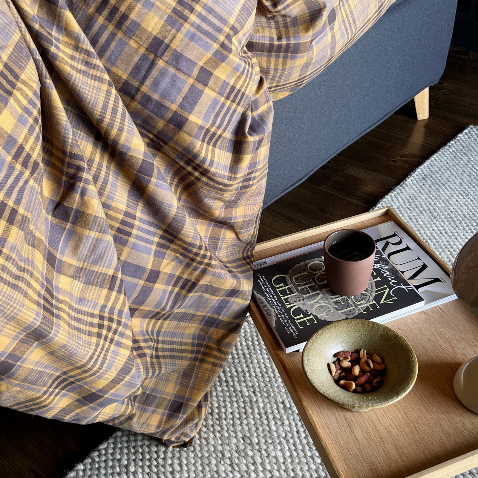 Farge: Sennepsgul og grått klassisk rutemønster.