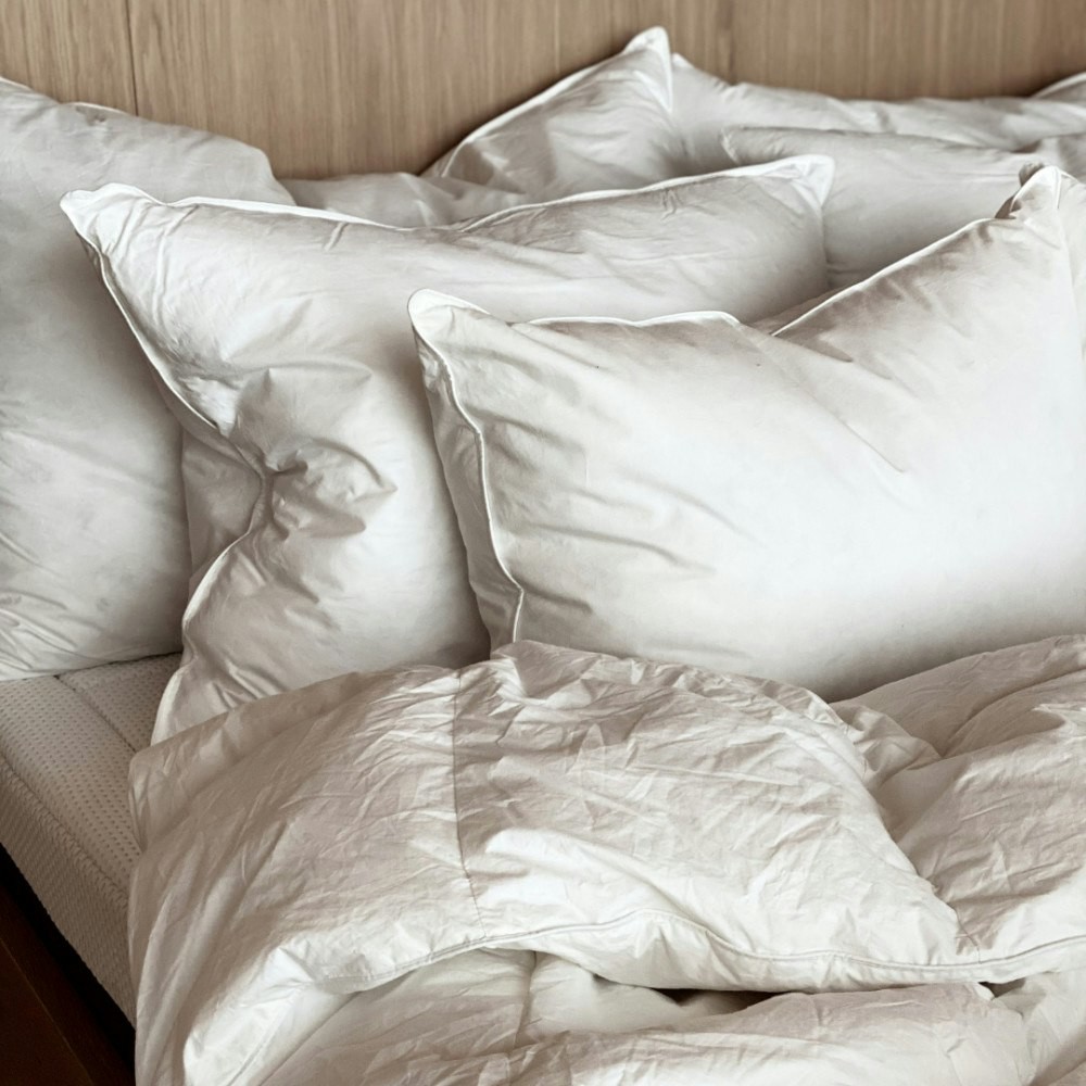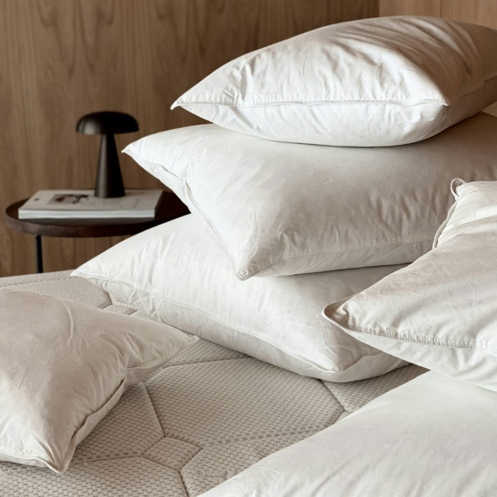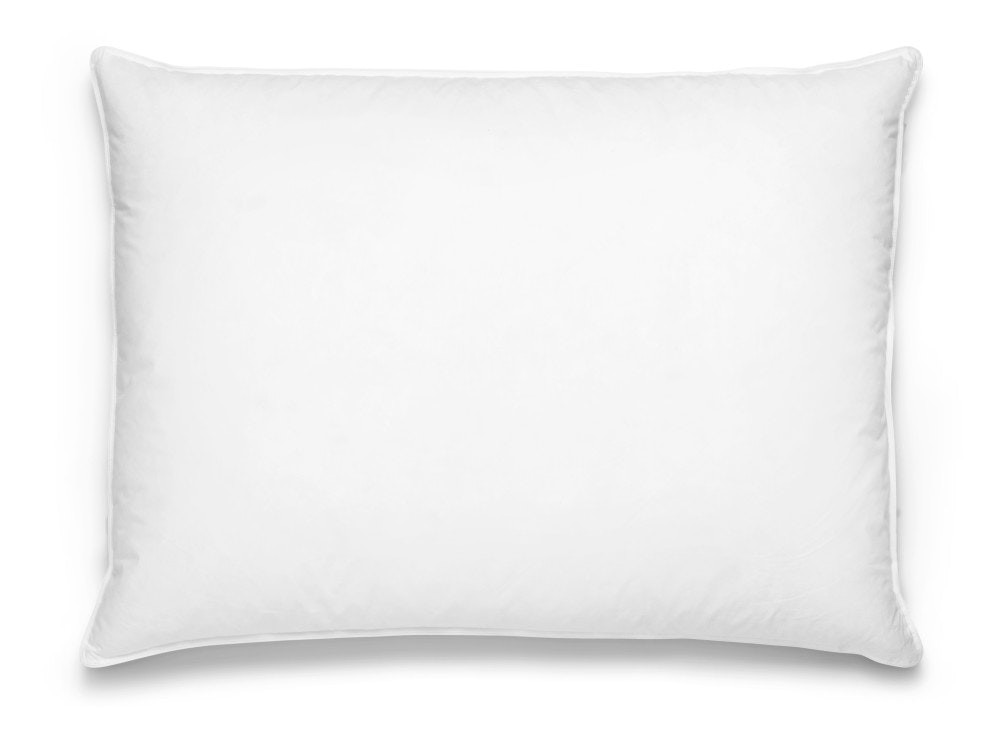 En velfylt gåsedunpute. Puten er medium fast, med god støtte og høyde.