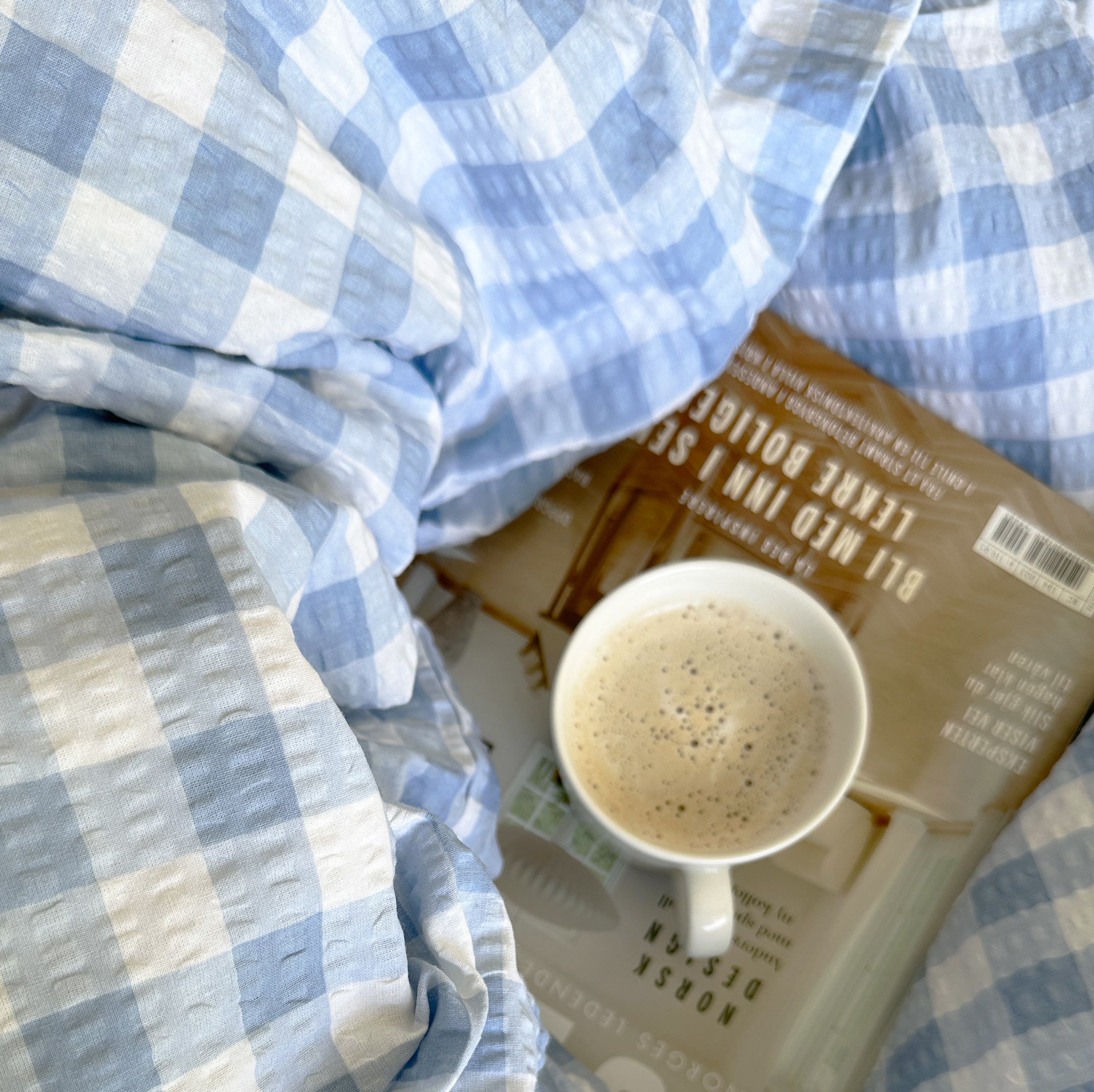 Bjerregaard Krepp har et rent og tidløst design. Dette sengesettet har hvite og lyseblå ruter.