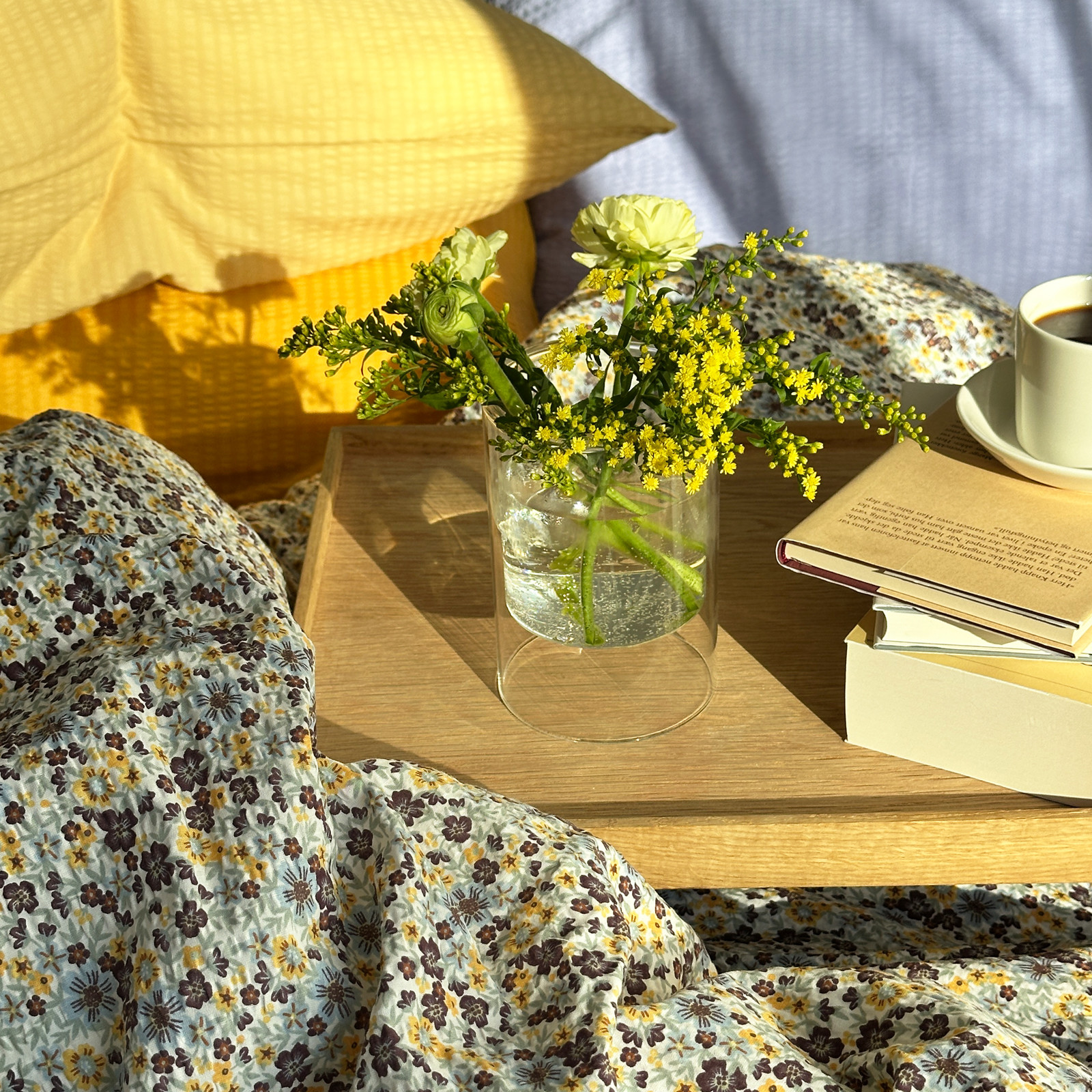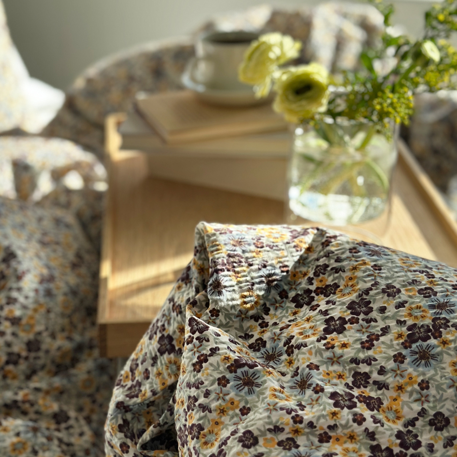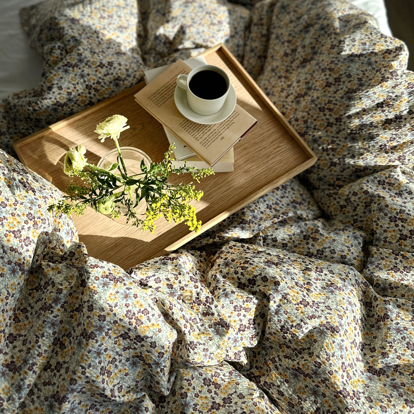 Dette sengesettet har et nostalgisk blomstermønster, med gul, burgunder og dus grønn, på hvit bunnfarge.