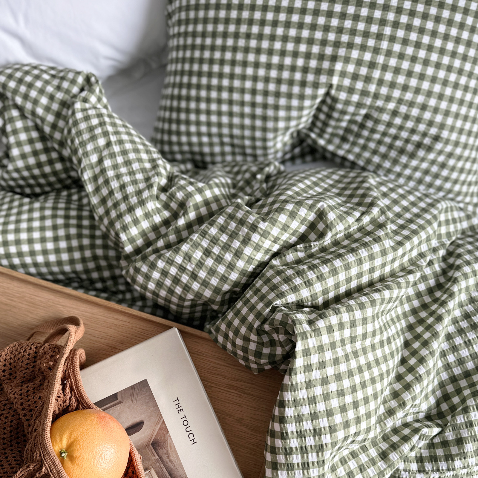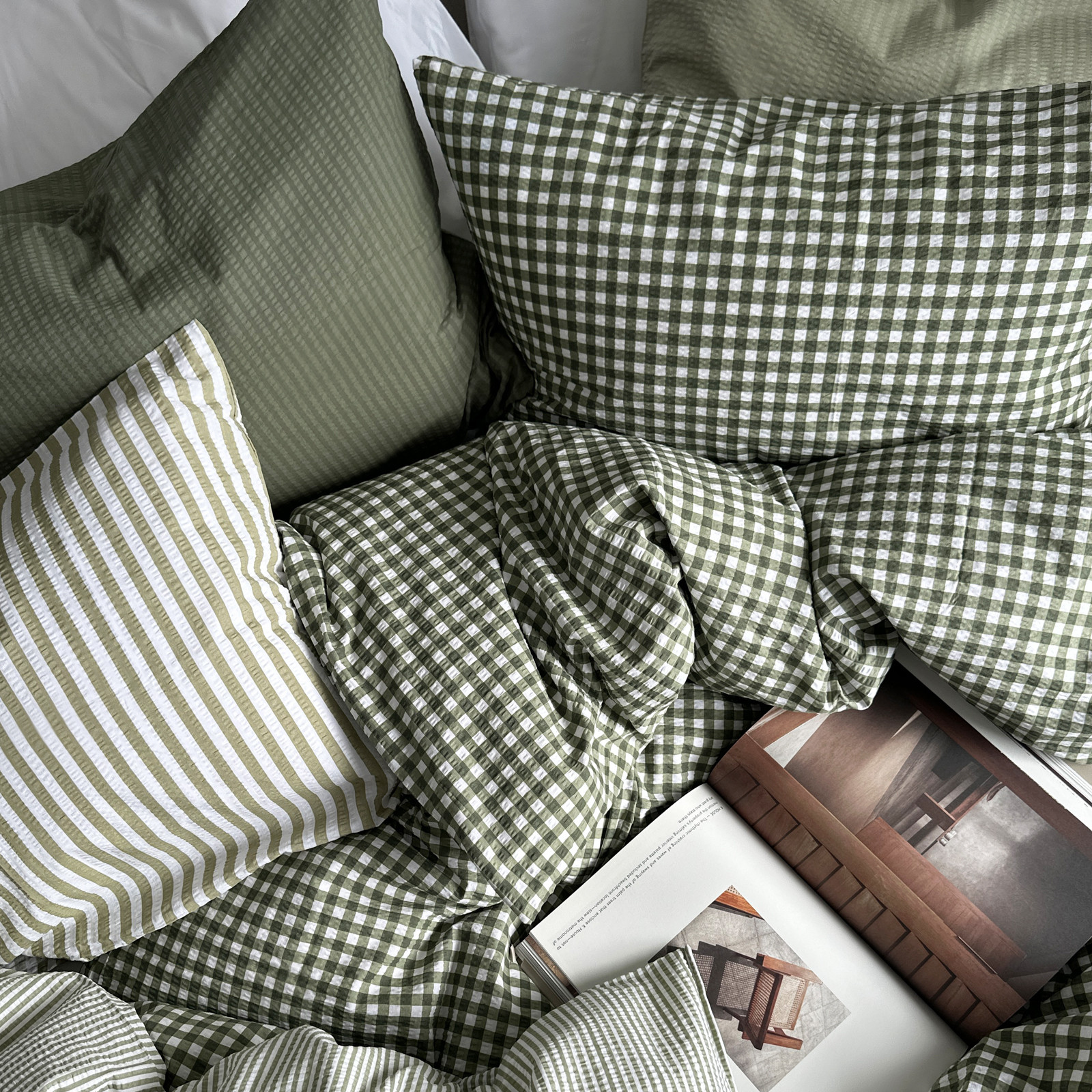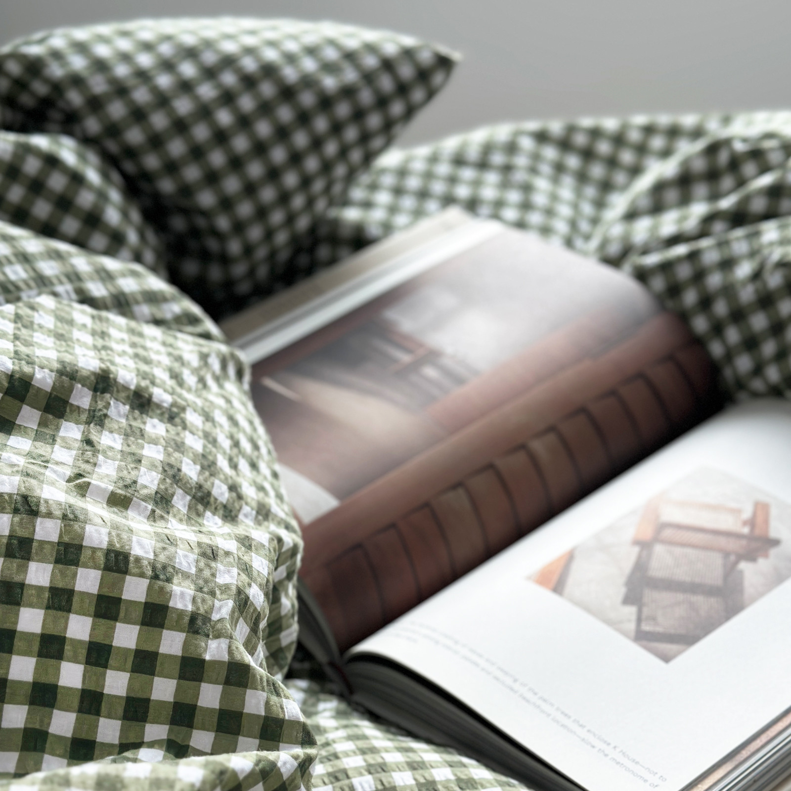 Bjerregaard Krepp har et rent og tidløst design. Dette sengesettet har et grønt og hvitt rutete design.