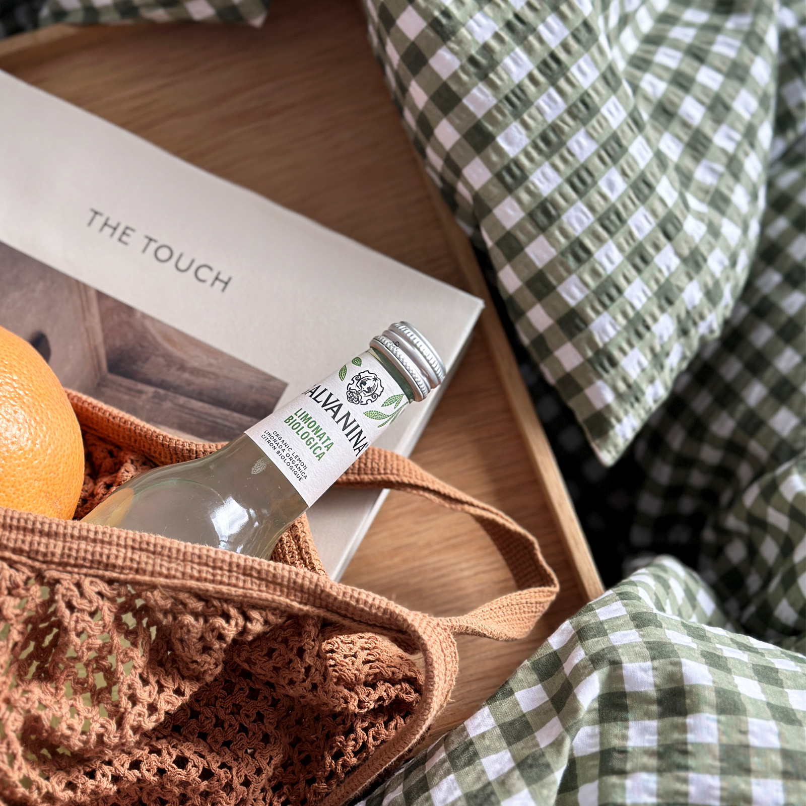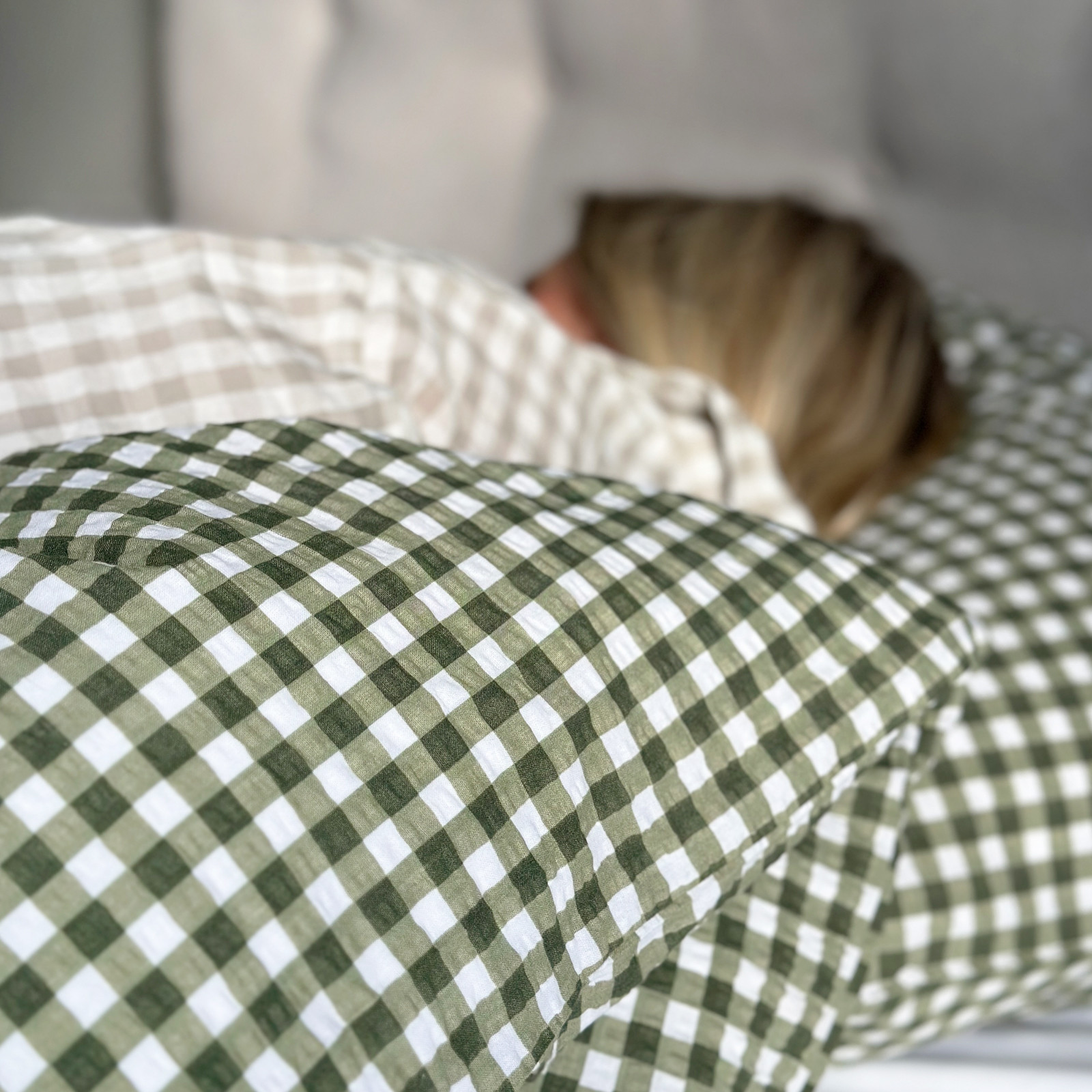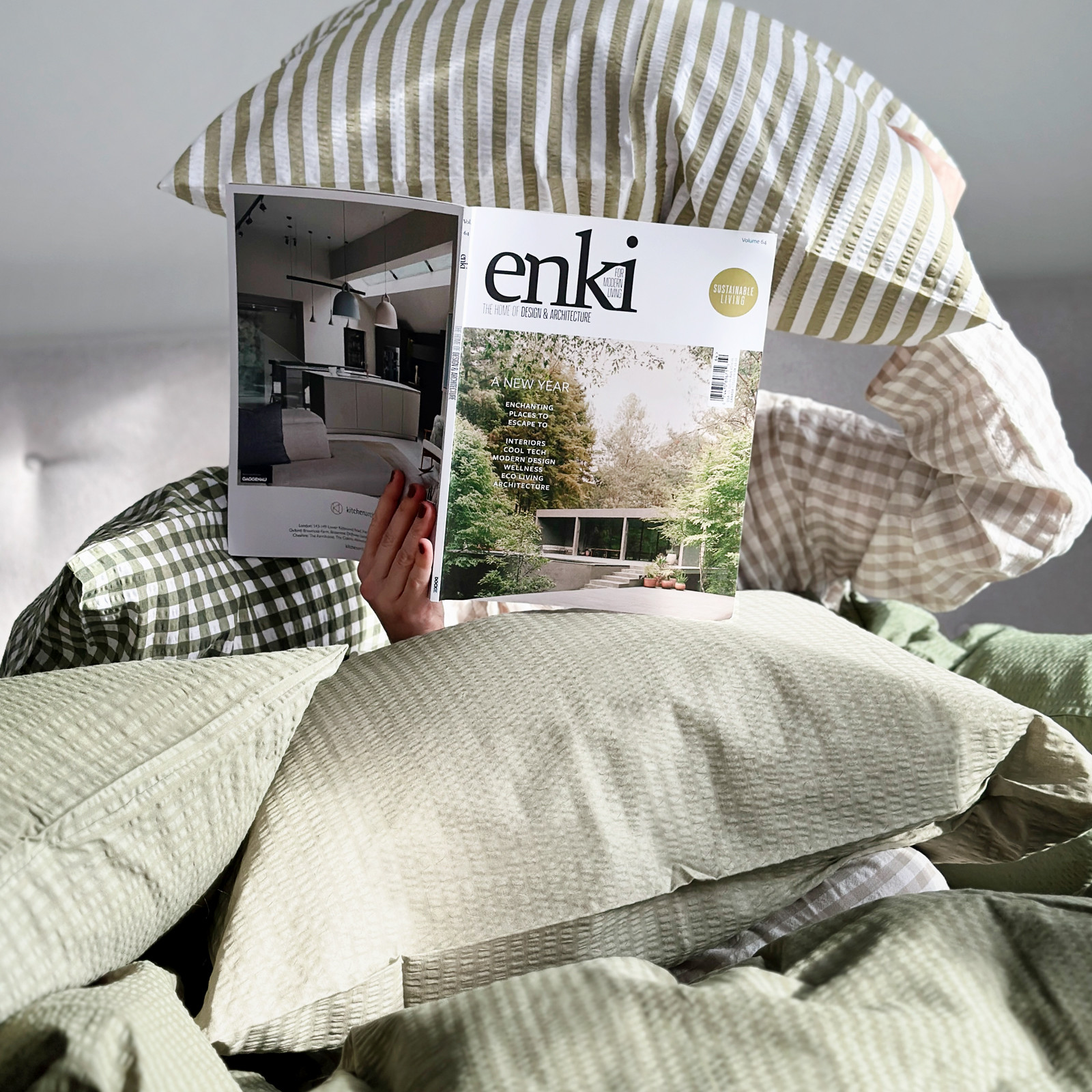 Bjerregaard Krepp har et rent og tidløst design. Dette sengesettet har et grønt og hvitt rutete design.