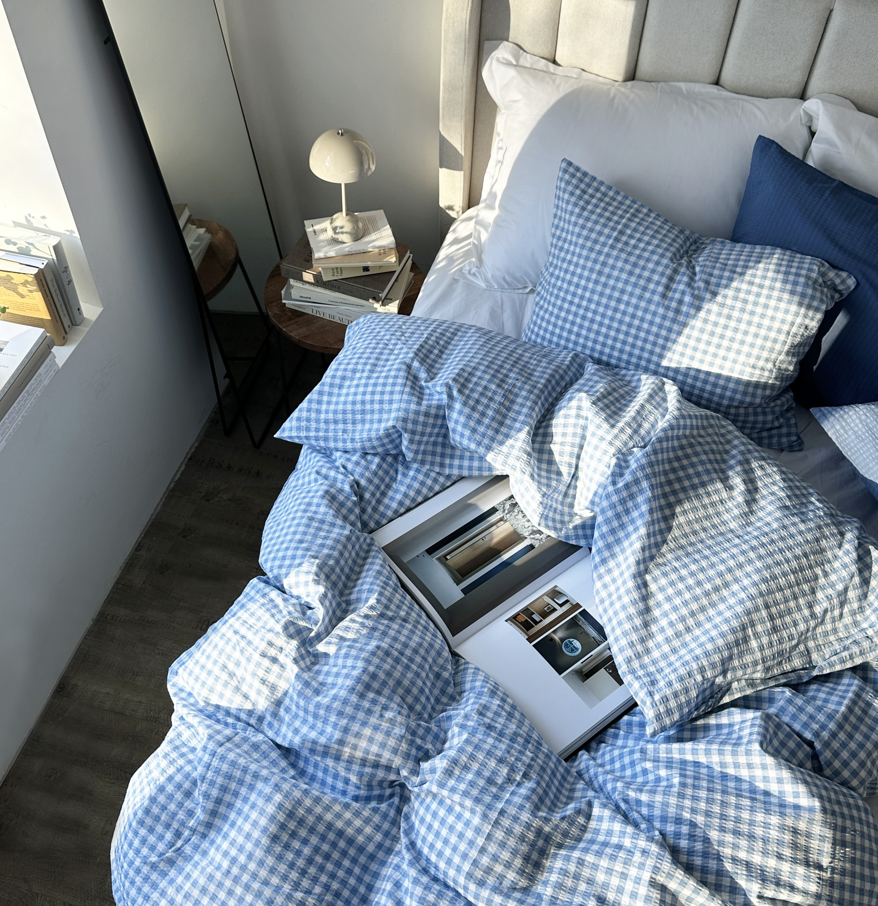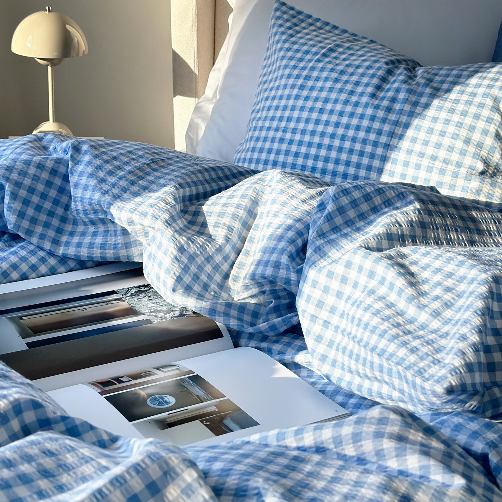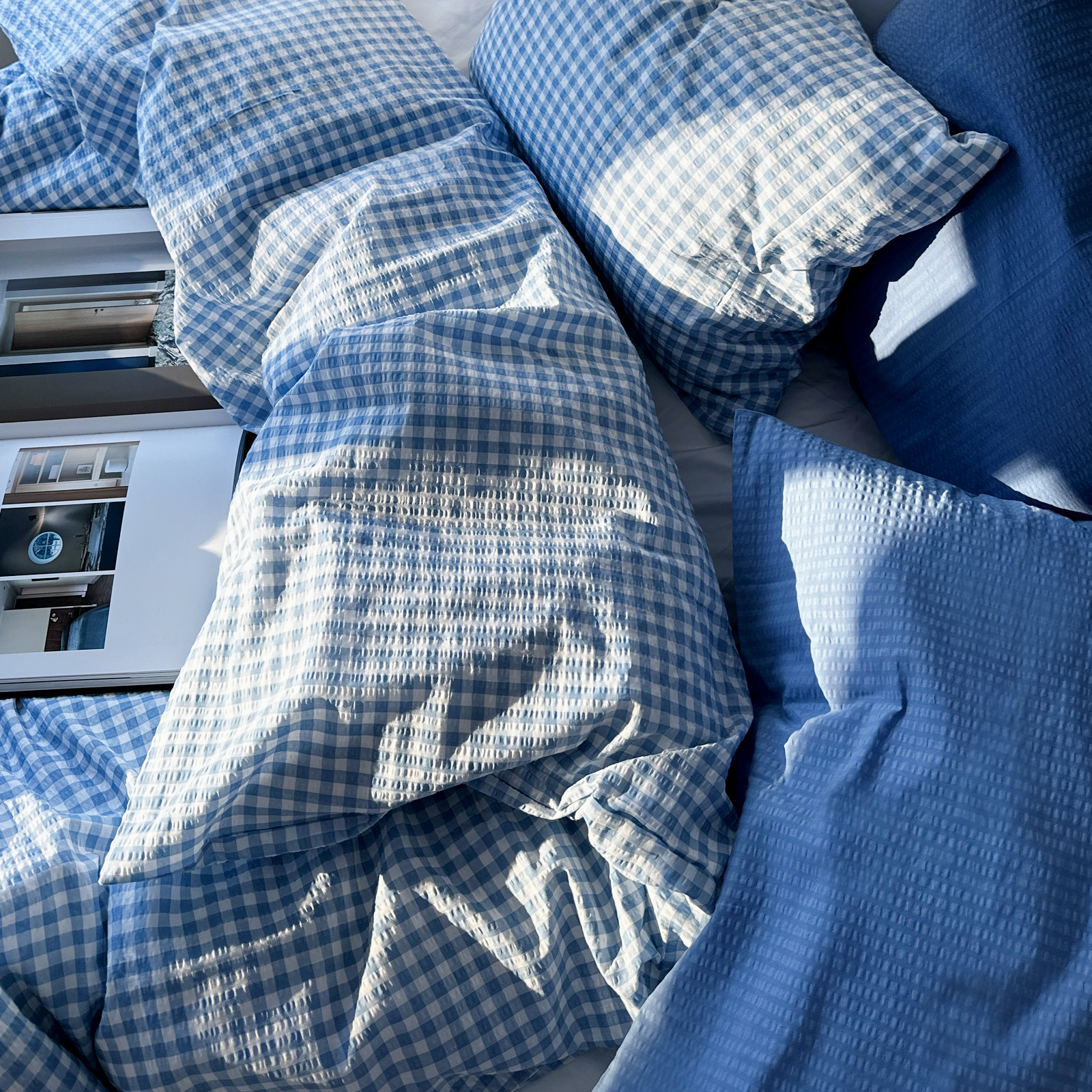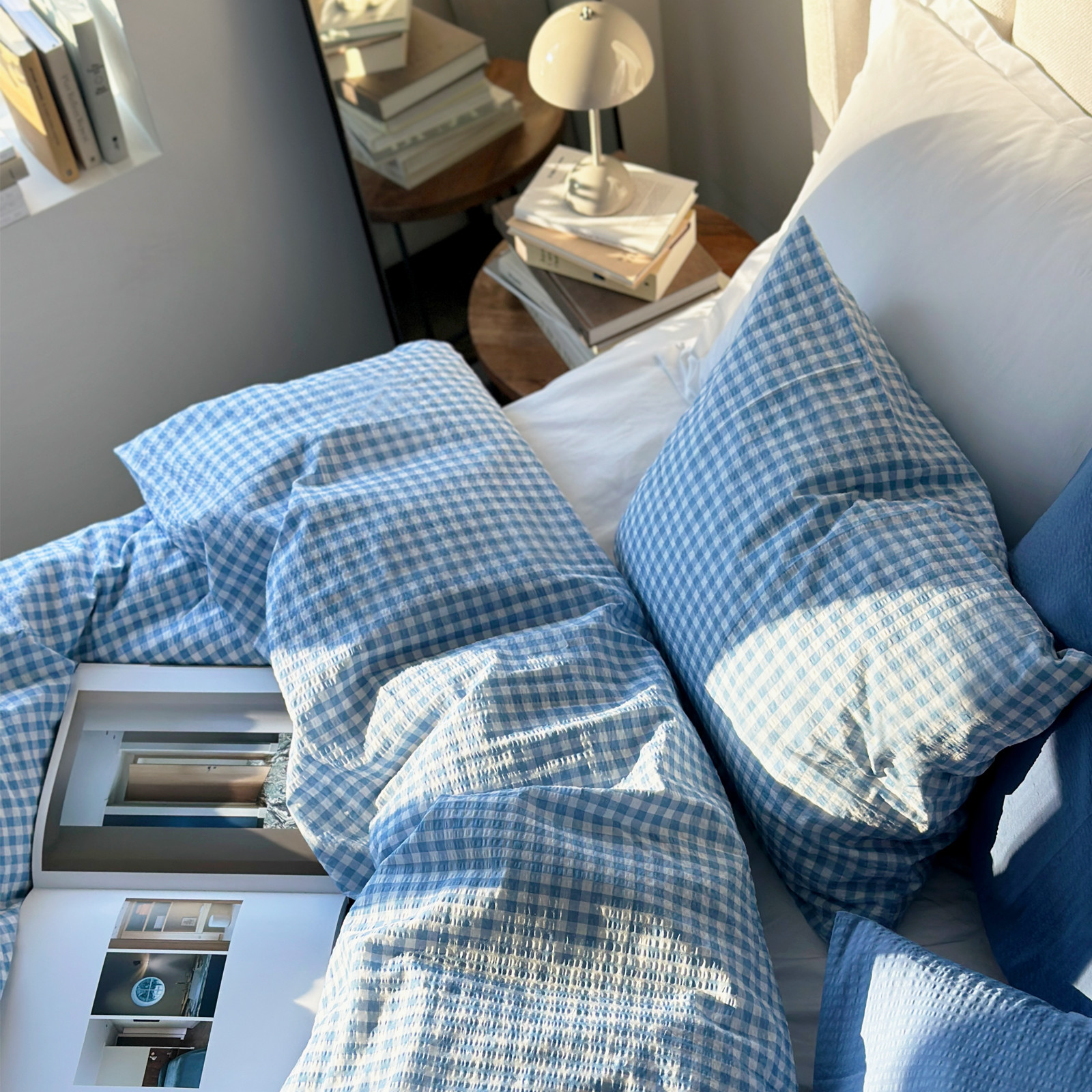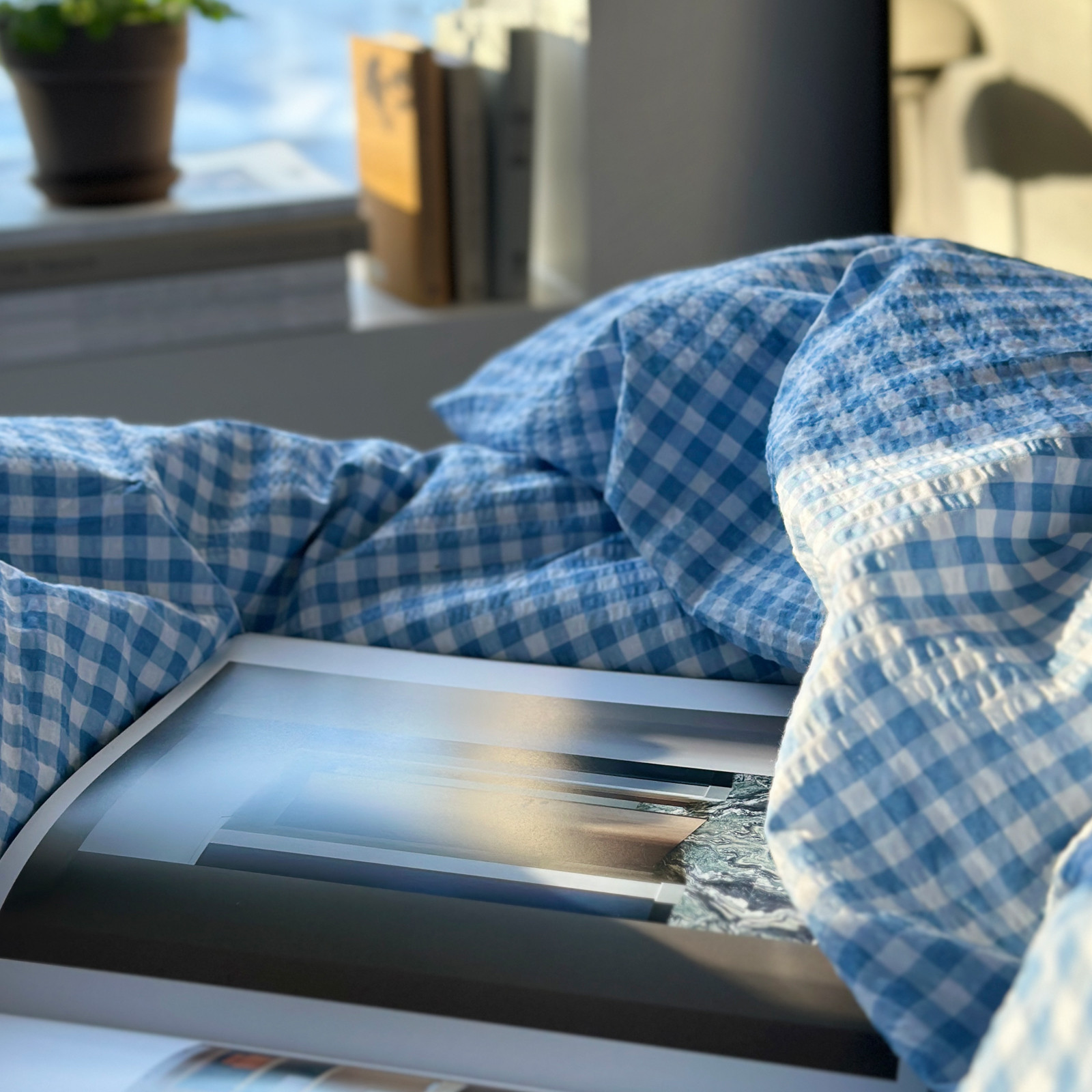 Bjerregaard Krepp har et rent og tidløst design. Dette sengesettet har hvite og blå ruter.